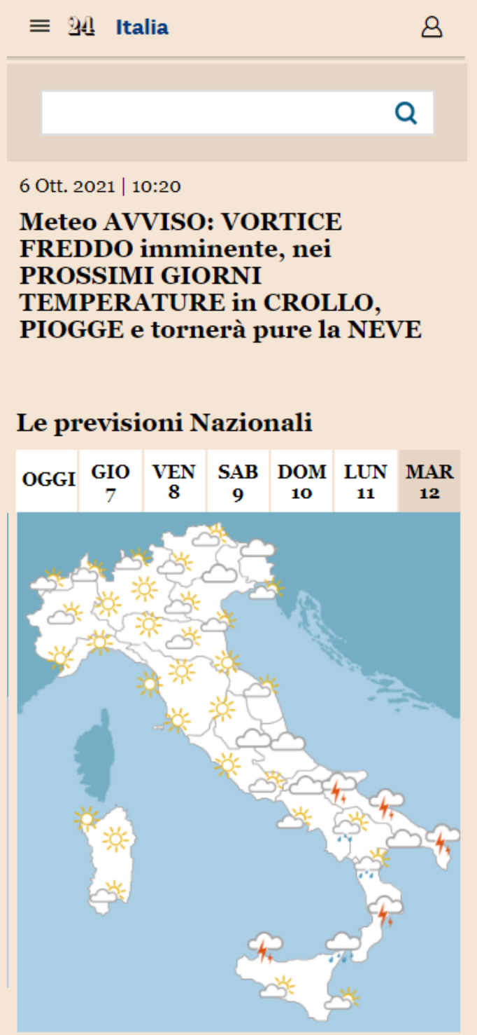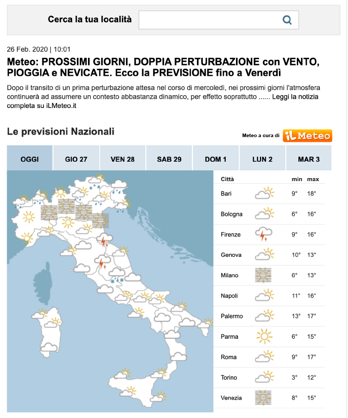 Realizziamo per i partner Editoriali e non, mini siti Meteo, customizzati sulle esigenze grafiche e di comunicazione del Cliente affinché possano essi stessi fornire ai loro Utenti un servizio di previsione Meteorologica preciso e puntuale.